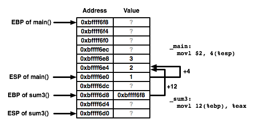 The bottom of main()’s stack frame is used for the function call parameters. ESP points to the bottom of its stack frame, so main() can refer to the parameters by taking ESP plus an offset. In the function sum3(), the EBP points to the top of its own stack frame, so it can access the same memory locations with EBP plus an offset.